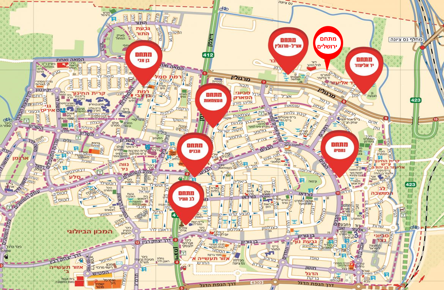 מתחם הטייסים מתחם ההסתדרות מתחם העצמאות מתחם אצ"ל-מרגולין מתחם ירושלים מתחם יד אליעזר מתחם נחמיה- רחבעם זאבי מתחם הבנים- ויצמן מתחם לב העיר